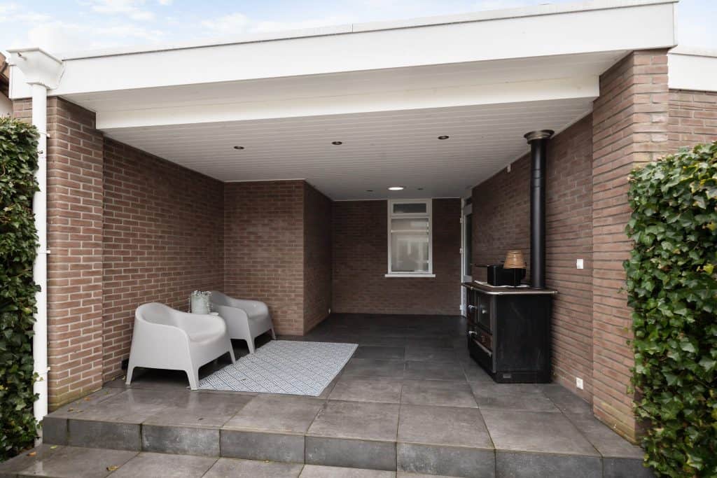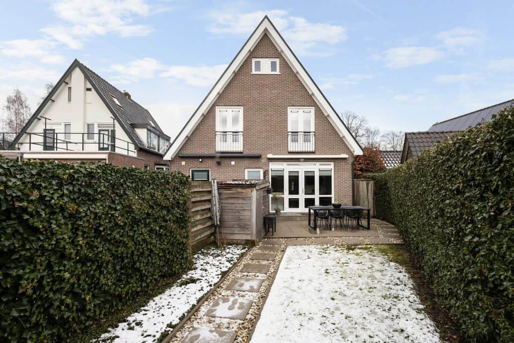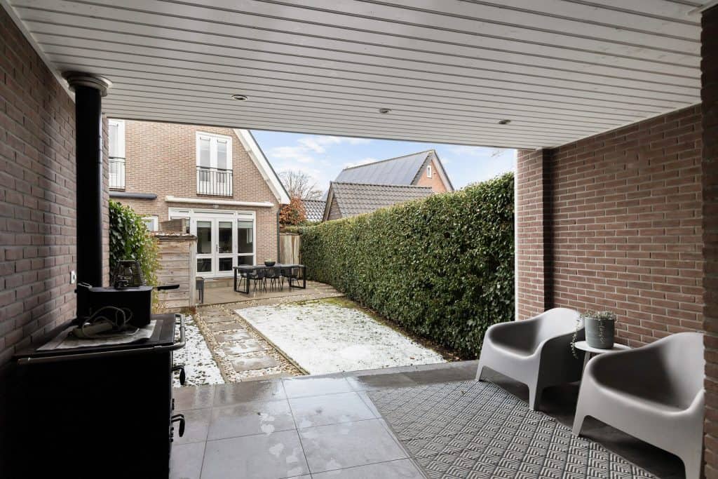 Langs de zijkant van de woning loop je door naar de diepe achtertuin. Deze is fraai aangelegd met sierbestrating, grind, borders en een royaal gazon. Achterin de tuin staat de garage met een luxe veranda, waar je vrijwel het hele jaar door heerlijk buiten kunt zitten met veel privacy. De garage is bovendien geïsoleerd en voorzien van een elektrisch bedienbare deur.