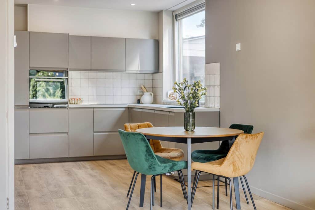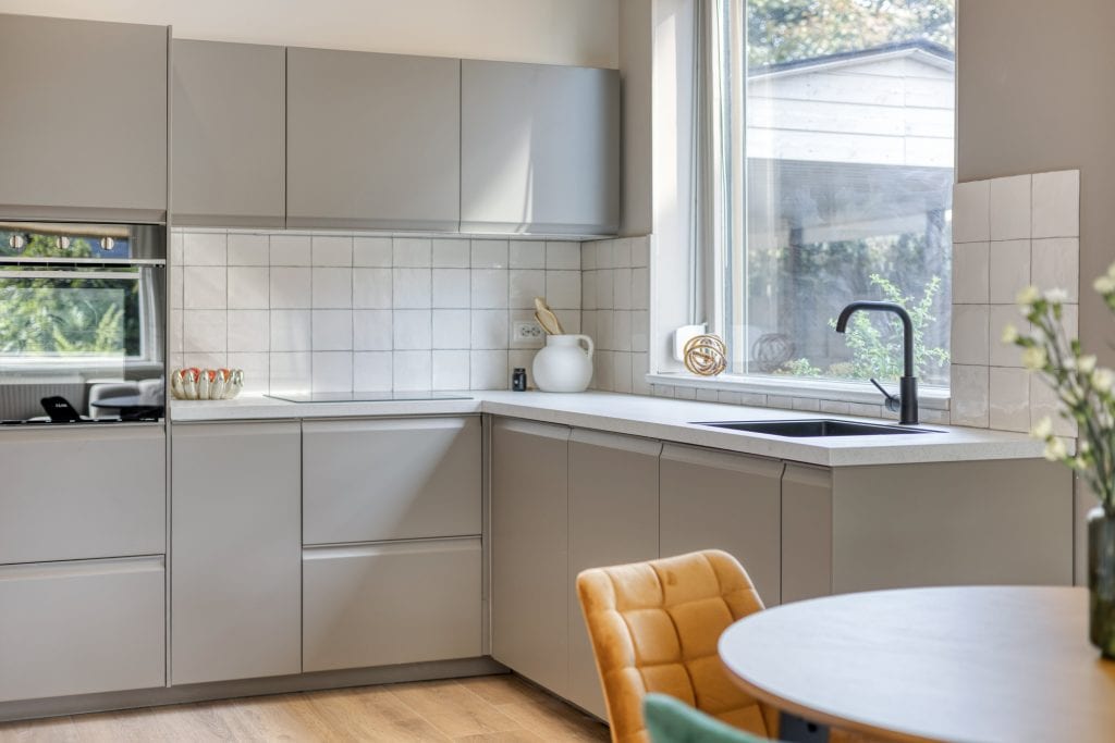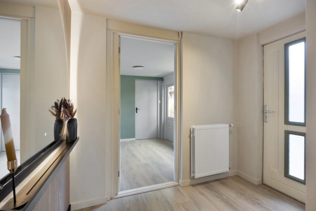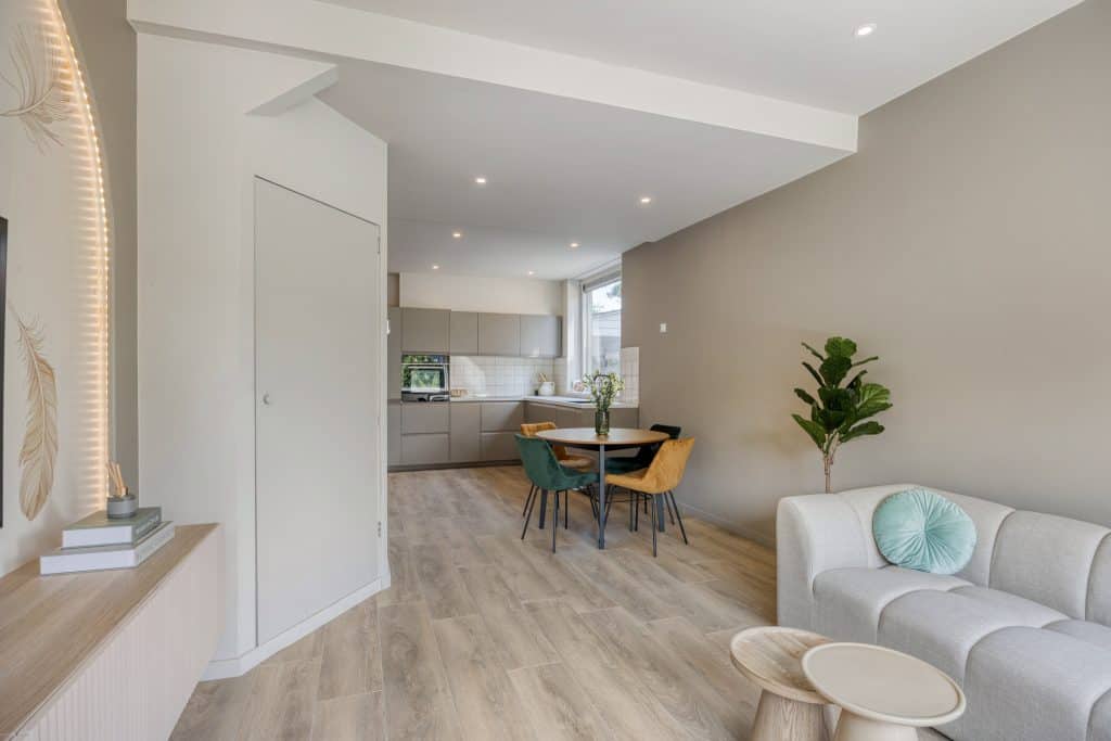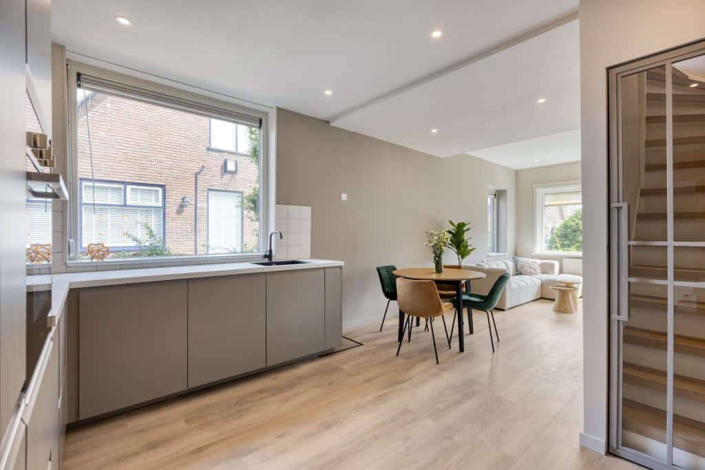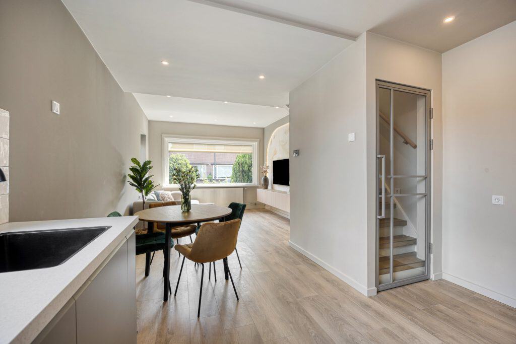 We komen binnen via de zij-entree/ hal. Bij binnenkomst zie je direct dat de woning recent gemoderniseerd is. Meteen de de hal is al mooi. De woonkamer bevindt zich aan de voorzijde. Hier vind je veel lichtinval en de oppervlakte is goed. Wandafwerkingen, vloeren, plafonds met spots, alles ziet er ook hier top uit. In de woonkamer vind je ook een binnenhal met een deur naar de kelder en een stalen deur met de trap naar de eerste verdieping. De open keuken is aan de achterzijde van de kamer gesitueerd. De moderne keuken is luxe uitgevoerd en is voorzien van alle benodigde inbouwapparatuur.