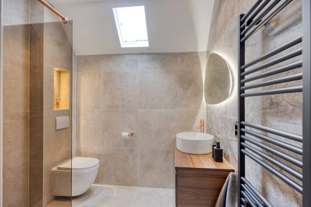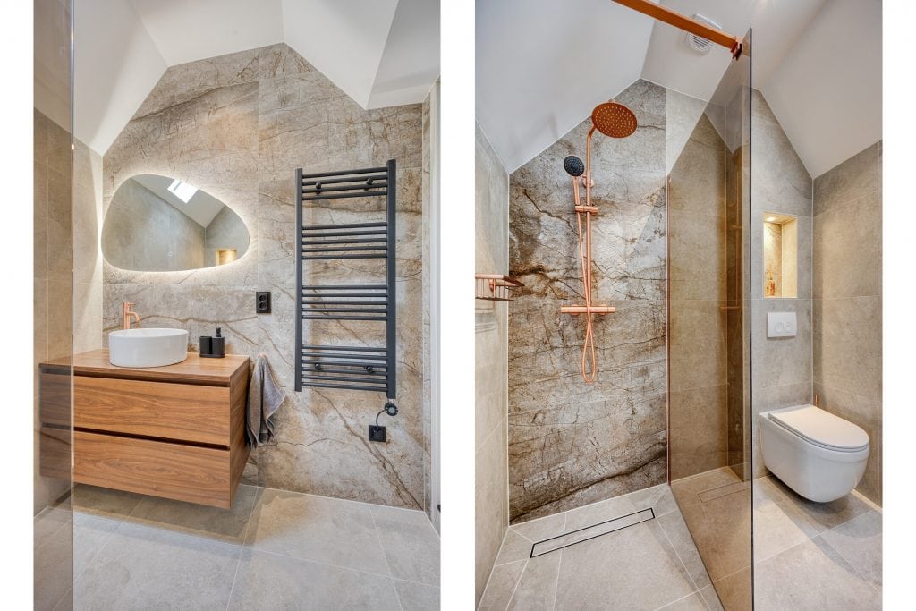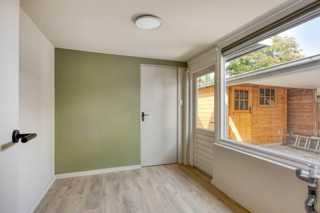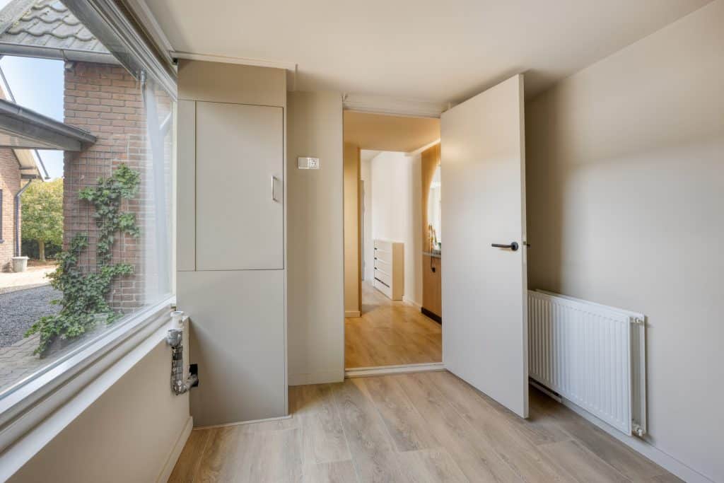 Vanuit de hal kom je ook in een strak afgewerkte extra kamer. Vanuit deze kamer kun je de tuin in en je vindt hier ook de deur naar de ruime, luxe, recent gemoderniseerde badkamer. Geheel betegeld, voorzien van een inloopdouche met hand- en regendouche, een zwevend wandcloset en een wastafelmeubel. Ook de badkamer is een plaatje om te zien.