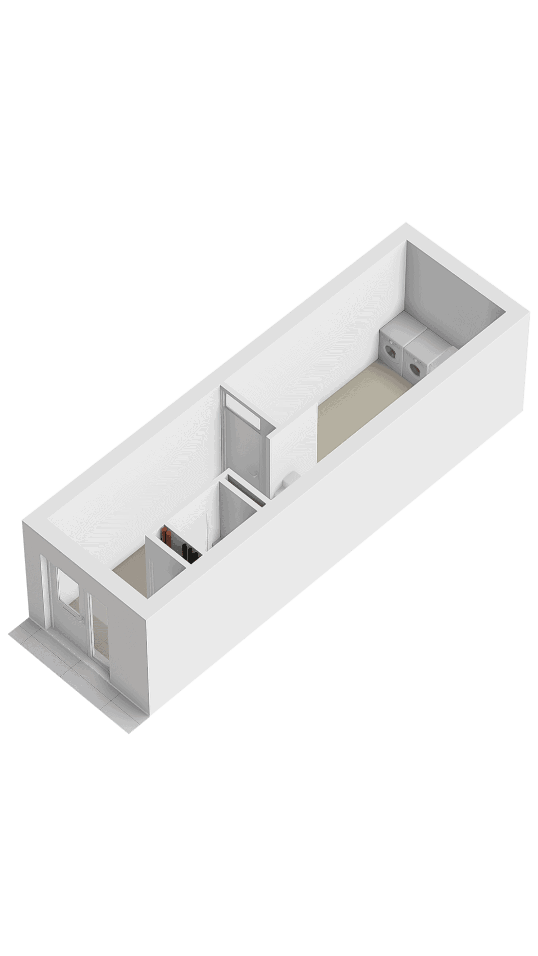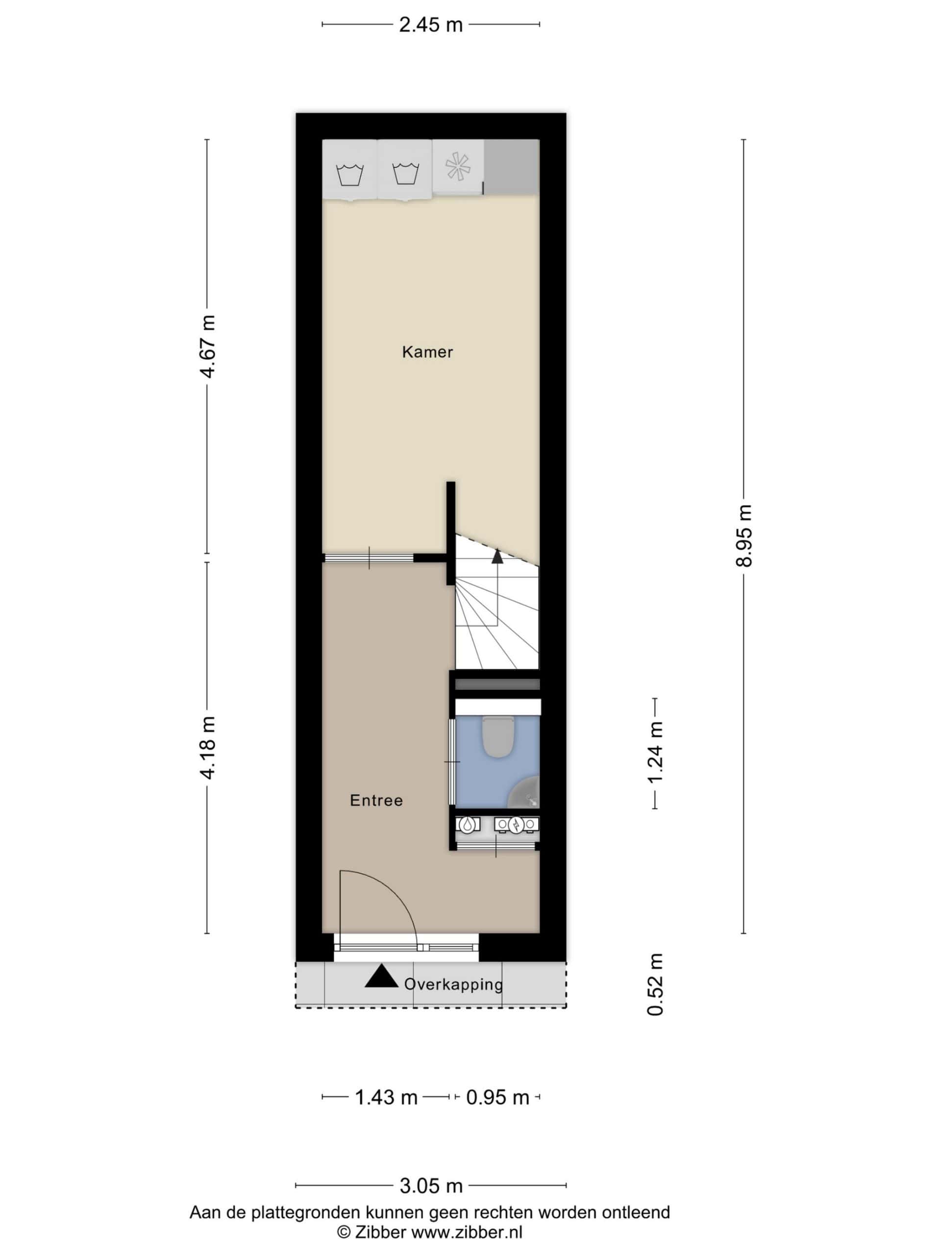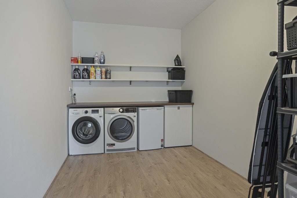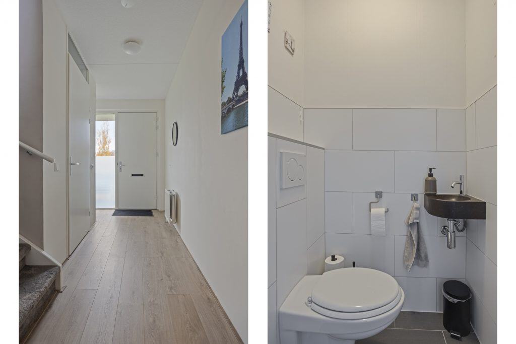 Je komt binnen op de begane grond via je eigen entree. Hier vind je een ruime hal met toegang tot het toilet (een vrijhangend wandcloset met een fonteintje), de meterkast en een ruime berging met aansluiting voor je wasapparatuur.