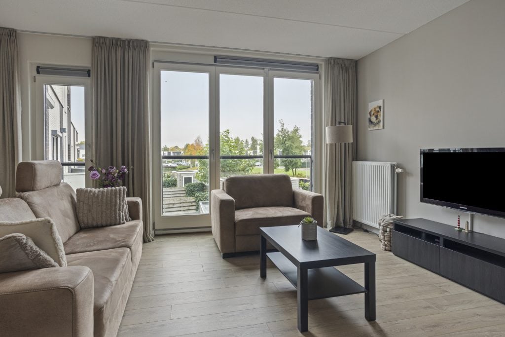 Via de trap kom je in de ruime woonkamer met veel lichtinval, voldoende ruimte voor een zit- en eethoek en een glazen harmonicapui waarmee je het buitengevoel echt binnenhaalt.