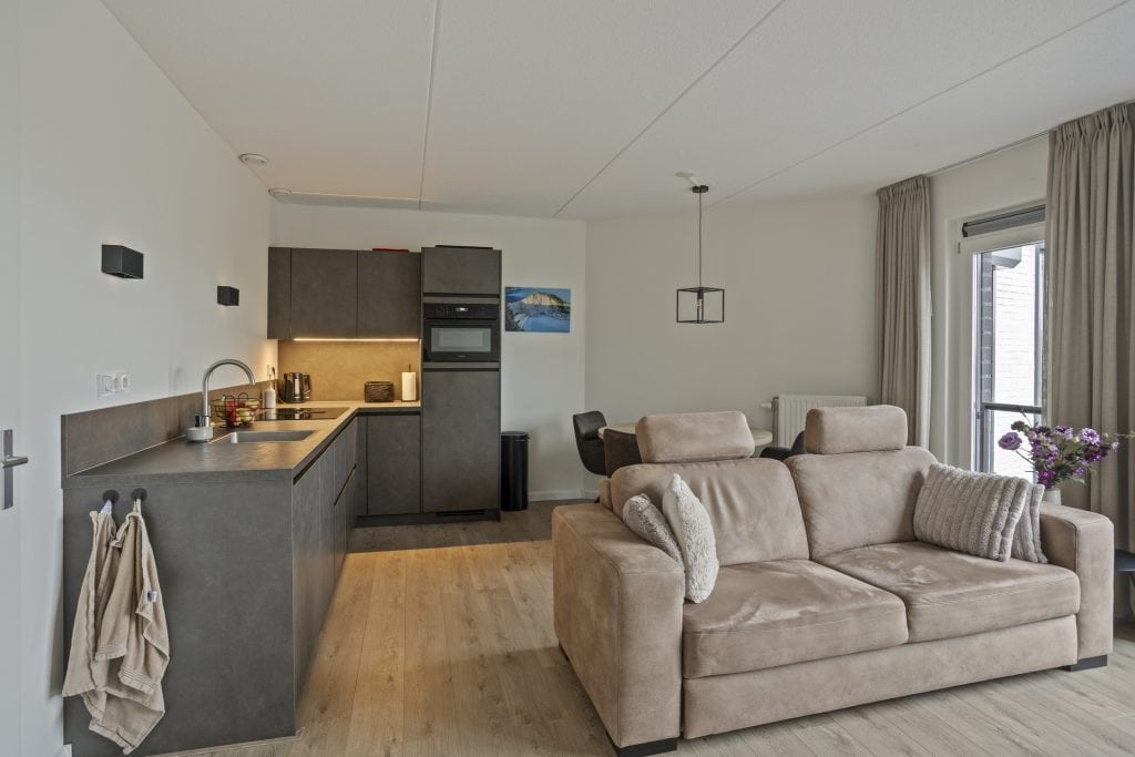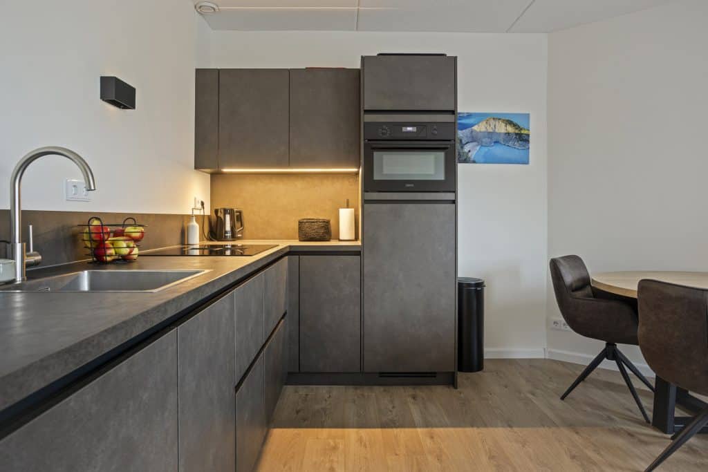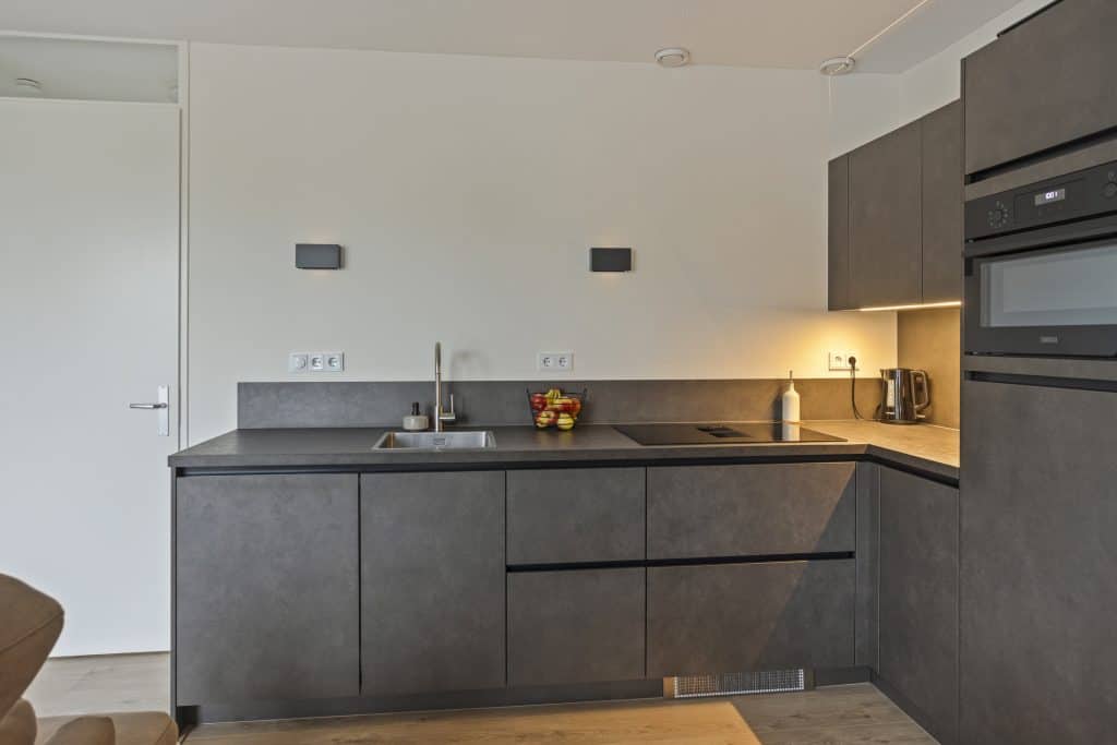 De luxe open keuken is voorzien van alle gemakken (4-pits inductiekookplaat met downdraft afzuigkap, vaatwasser, koelkast en een combi-oven).