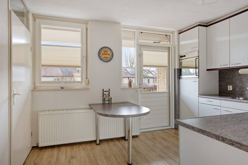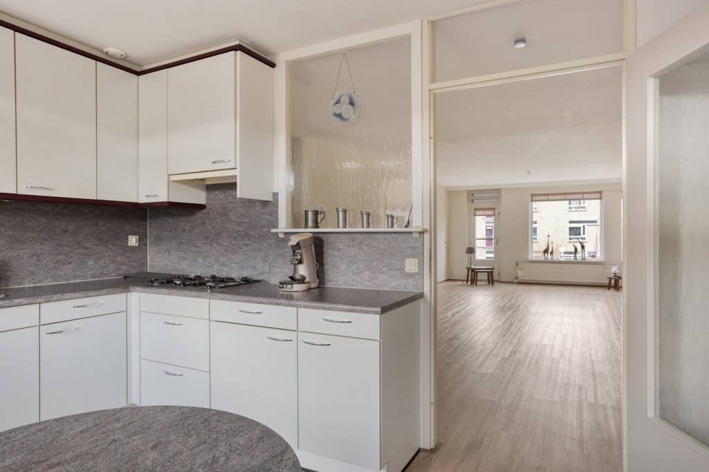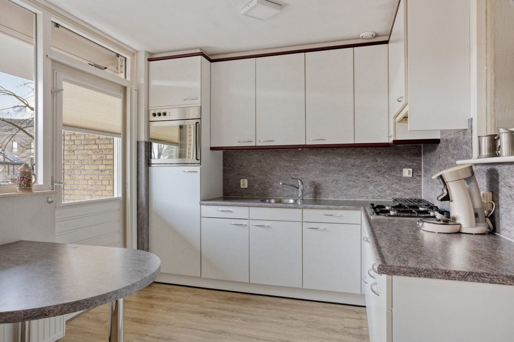 Aansluitend aan de woonkamer bevindt zich de keuken, geplaatst in een praktische hoekopstelling en voorzien van voldoende werk- en kastruimte. Grenzend aan de keuken is een ruime provisiekast. Vanuit de keuken heb je tevens toegang tot het royale balkon, dat groot genoeg is om met een gezelschap comfortabel te zitten en rustig is gelegen aan de achterzijde.