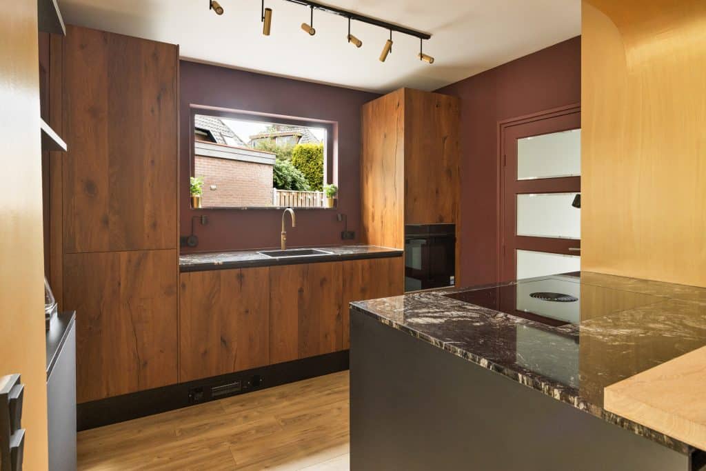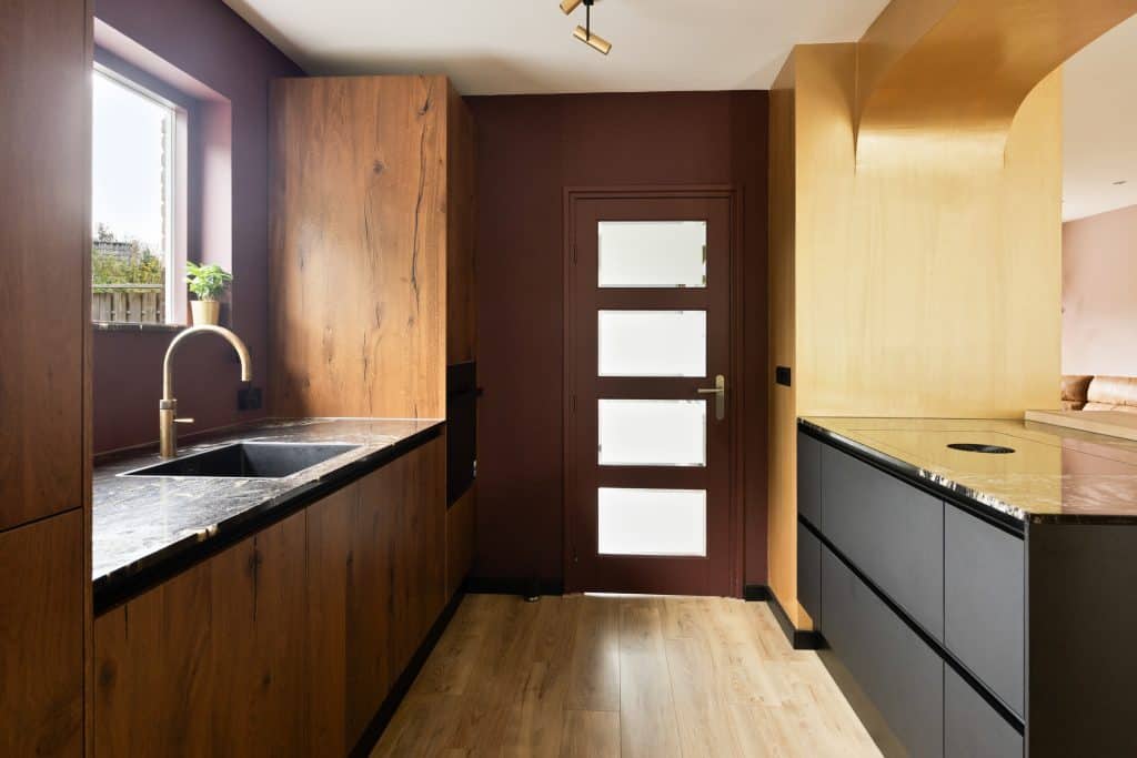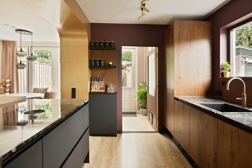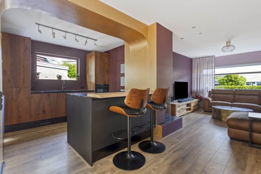 We komen binnen via de hal met provisiekast en toilet. Vanuit hier loop je door naar de open keuken, uitgevoerd in een fraaie kleurstelling met een mooi werkblad en voorzien van hoogwaardige apparatuur: een Bora kookplaat, Miele vaatwasser en koelkast, een Siemens stoomoven, een Quooker-kraan én een kickspace-verwarming in de plint.