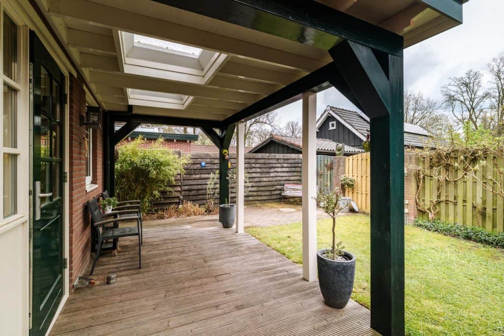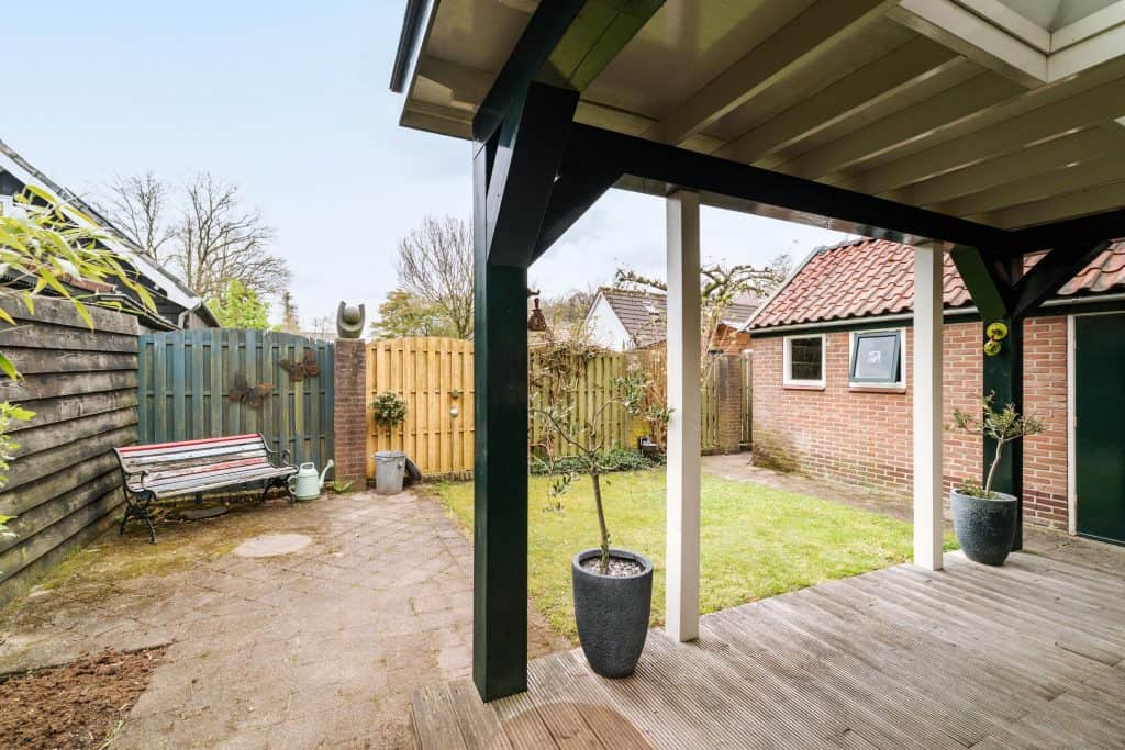 Buiten: Onder de veranda direct aan de woning is het heerlijk vertoeven. Hier geniet je van het vrije uitzicht en de groene omgeving. De tuin is met zorg aangelegd, er is een stukje gazon en mooie borders, en er is een stenen garage. Je auto parkeer je op de inrit.