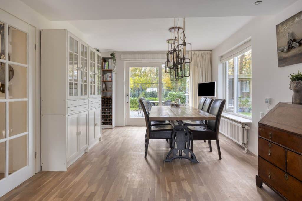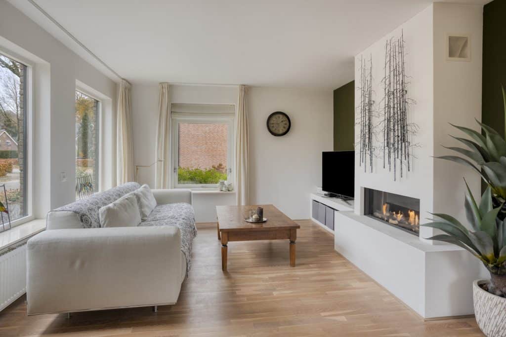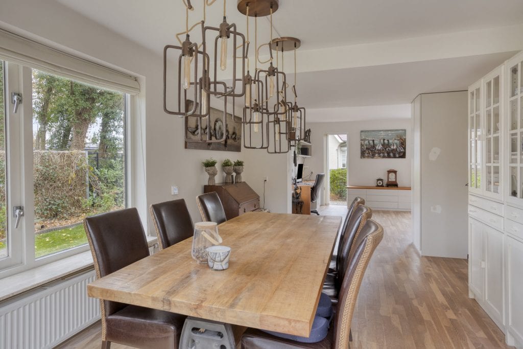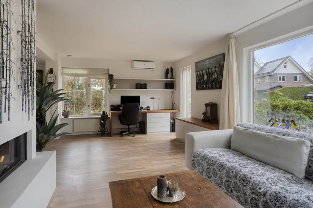 We komen binnen in de hal met het moderne toilet, ruimte voor de garderobe, de meterkast en de trap naar de verdieping. We lopen door naar de woonkamer. Dit is meteen al een prettige ruimte met een mooie oppervlakte, veel lichtinval, strak gestucte wanden, een sfeervolle gashaard, een eikenhouten vloer en een airco. Er is hier ruimte genoeg voor het plaatsen van een grote zithoek. Aan de achterzijde van de woonkamer is er ruimte voor het plaatsen van een grote eettafel. Je kunt hier heerlijk tuingericht zitten. Door middel van een schuifpui is de tuin te bereiken.
