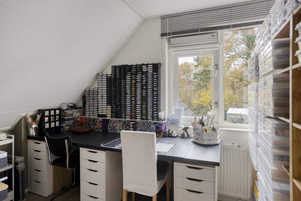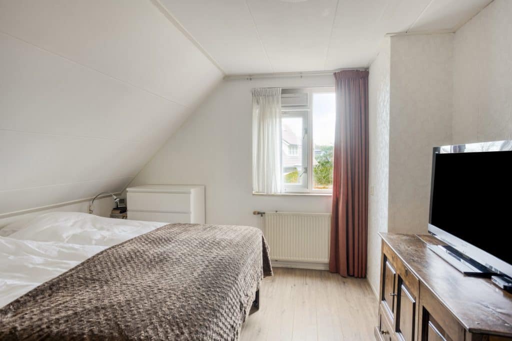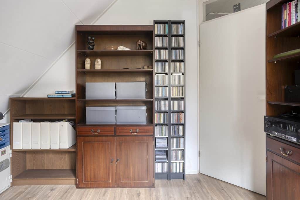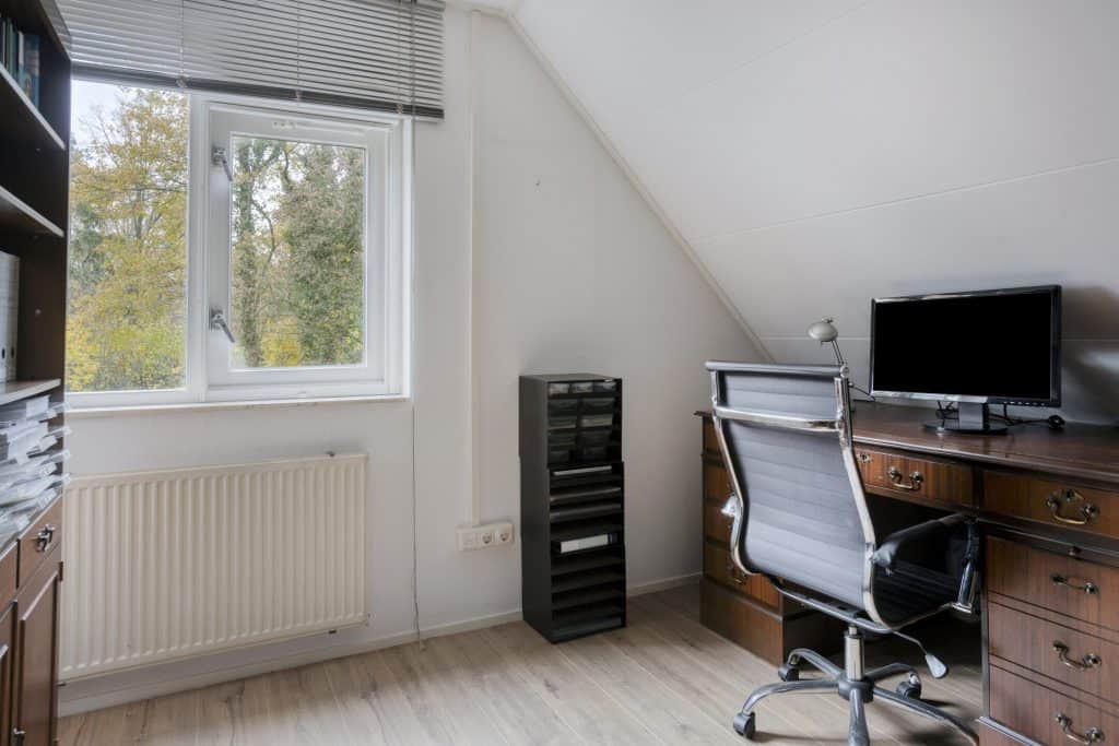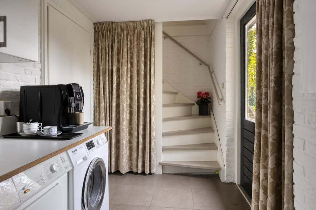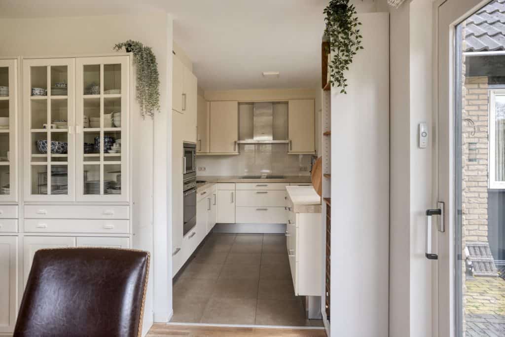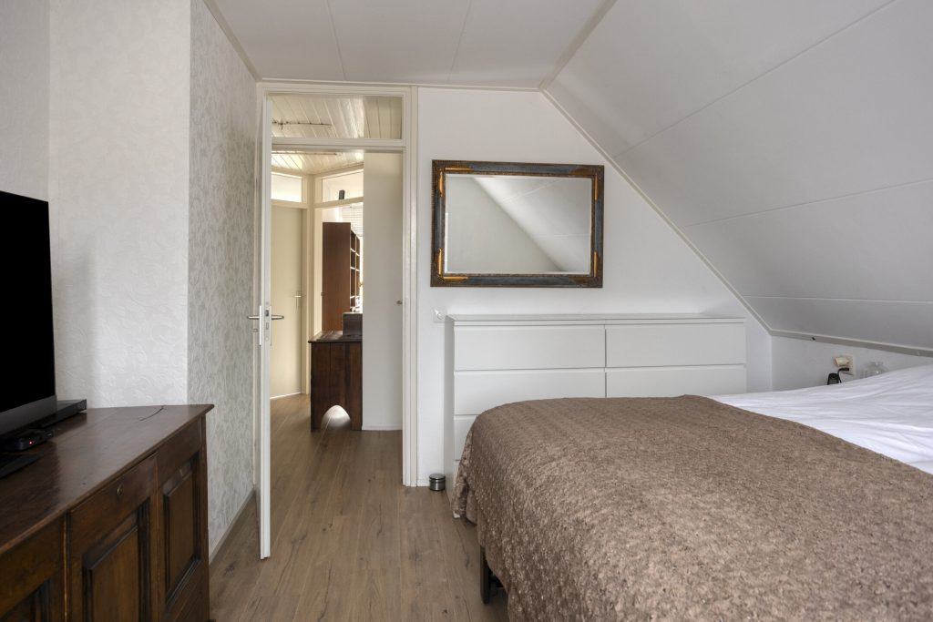 Vanuit de keuken is een praktische en ruime bijkeuken bereikbaar, Vanuit de bijkeuken kun je de tuin en garage in. Daarnaast vind je hier een vaste trap die toegang geeft tot een grote kamer met gevel- en dakramen boven de garage. Een ideale ruimte om te gebruiken voor opslag, als werk- of hobbykamer of als extra slaapkamer.