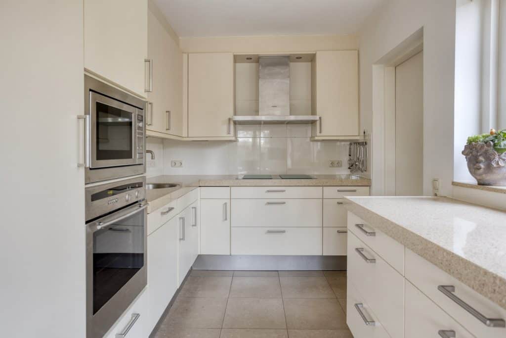 De keurige halfopen keuken heeft mooie keukenbladen, veel kastruimte en is uitgerust met alle benodigde inbouwapparatuur, waaronder een quooker.