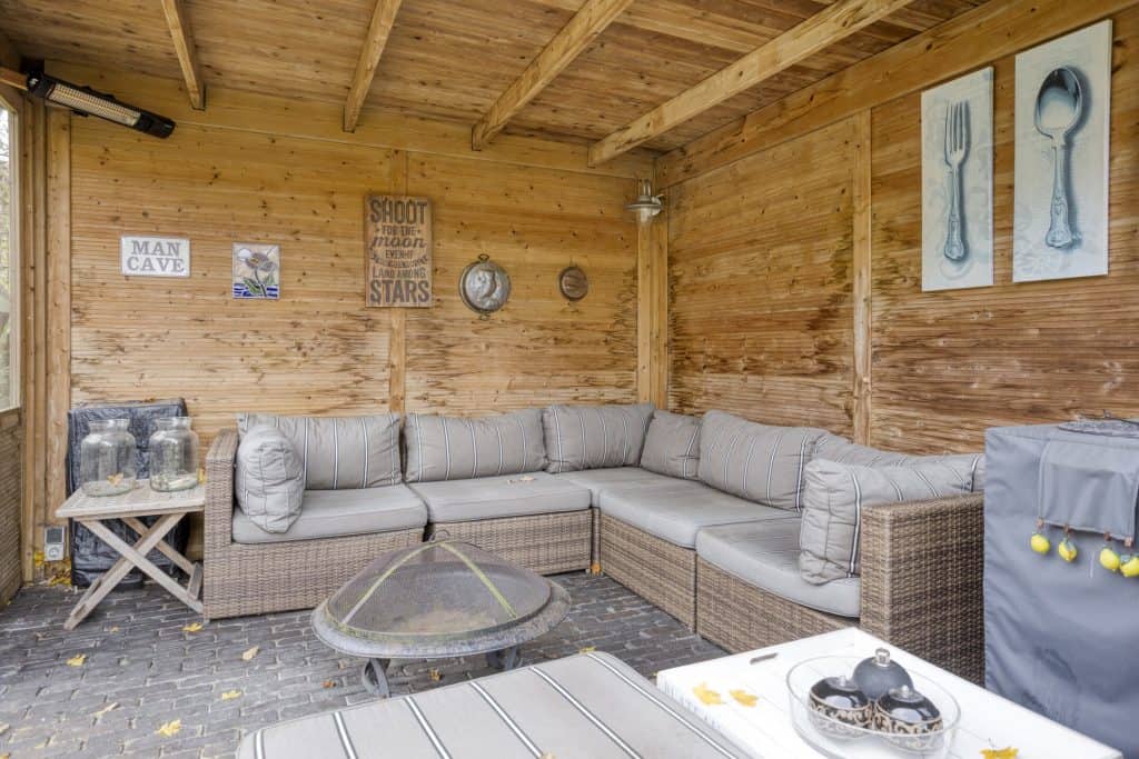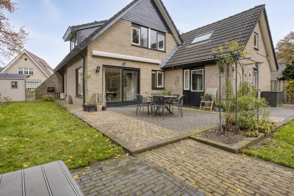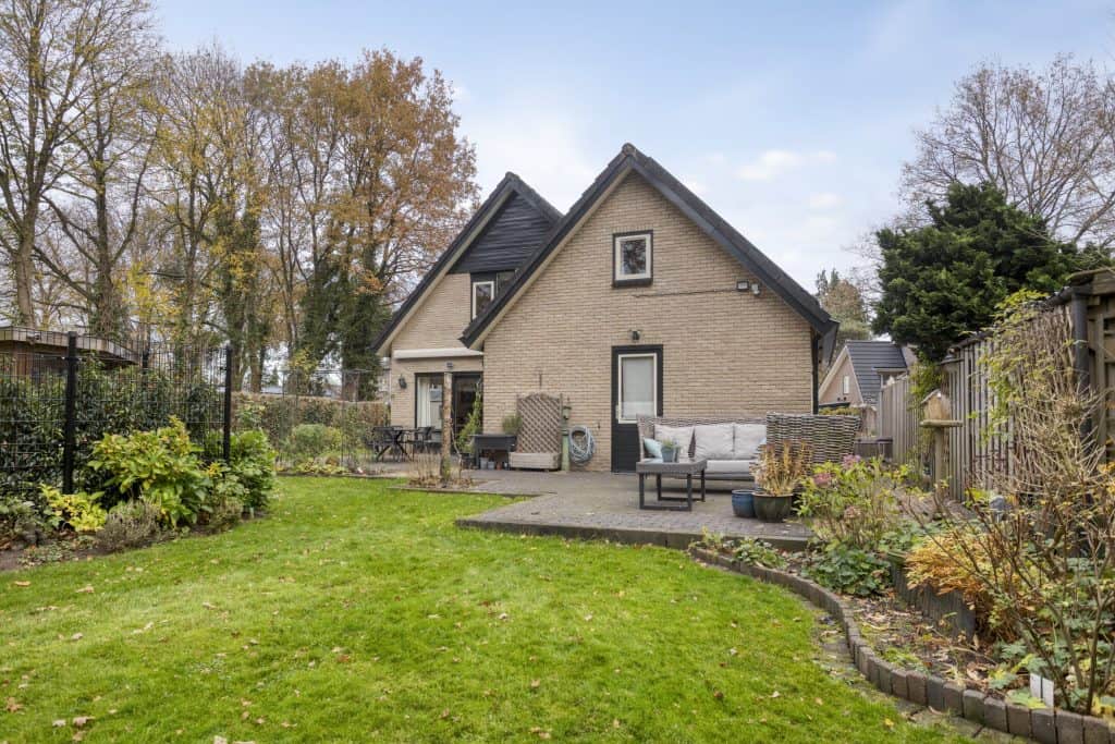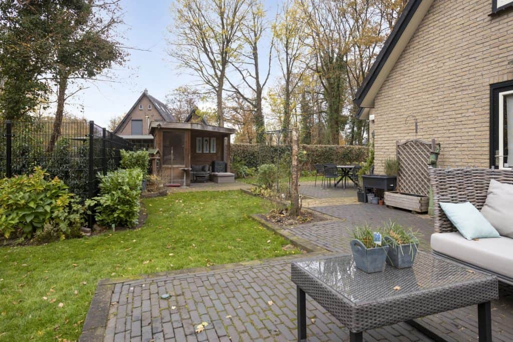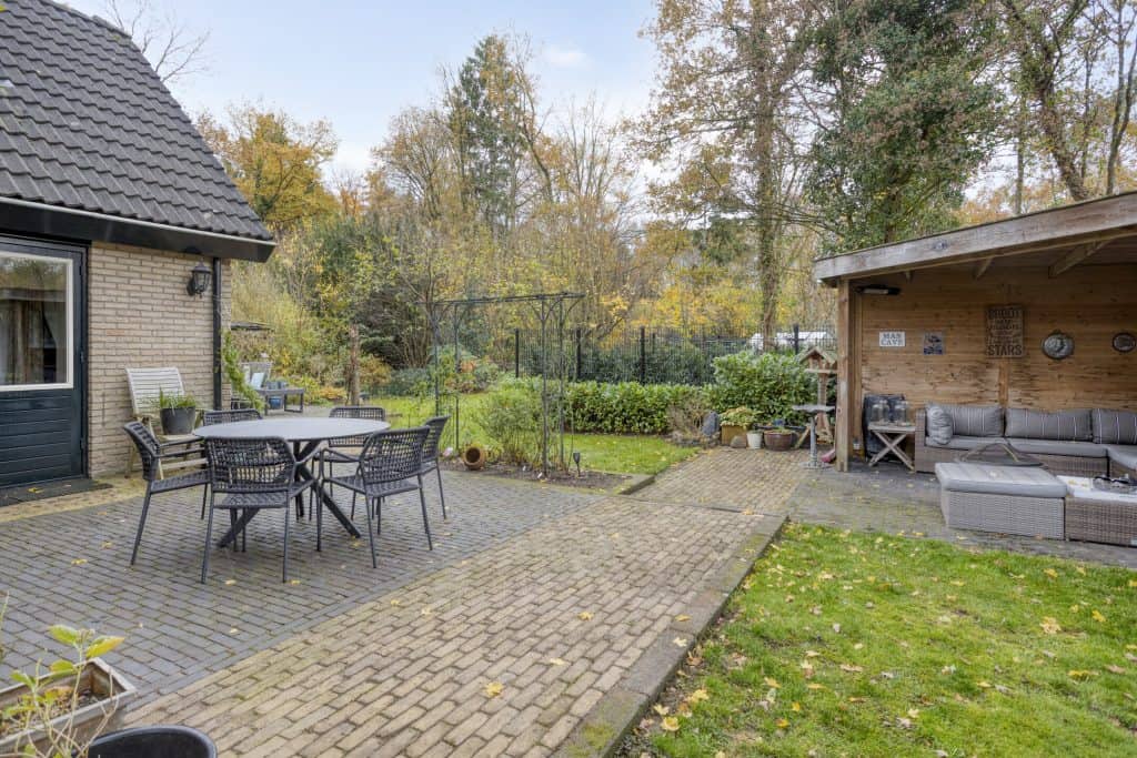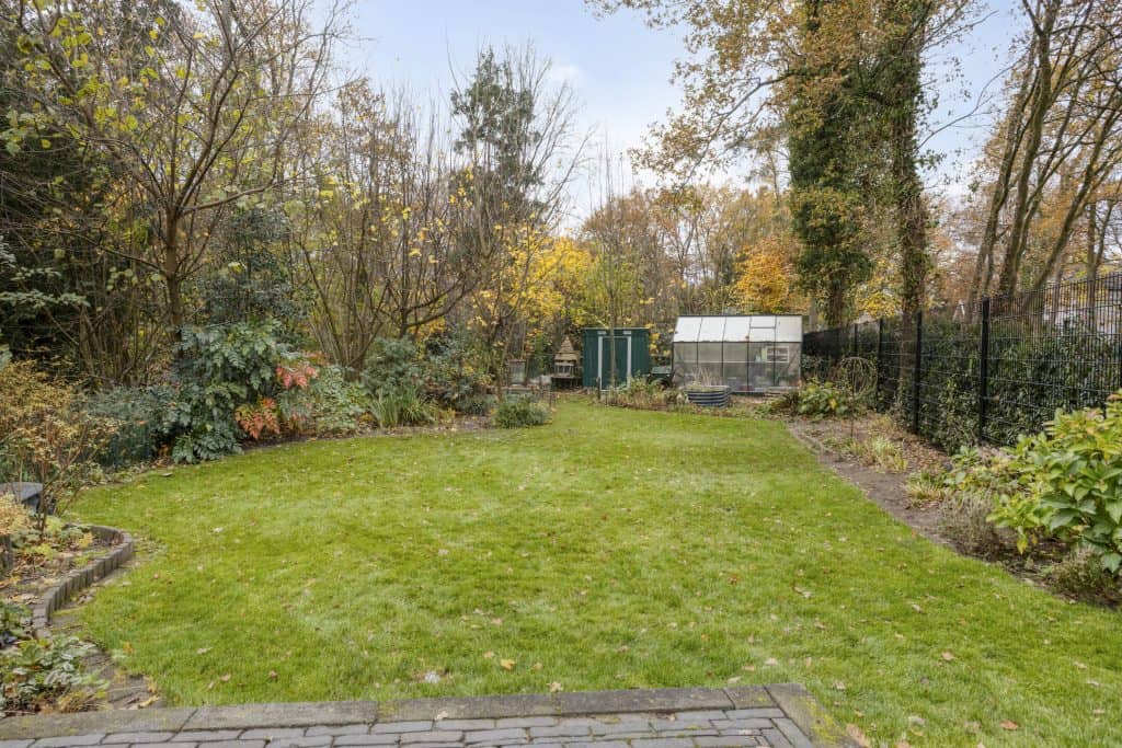 Een pluspunt is zeker ook de tuin. De grote, fraai aangelegde tuin biedt een heerlijke plek om van het buitenleven te genieten. De smaakvolle aanleg met diverse terrassen, gazon, sierborders en sierbeplanting geven hier een fijn buitengevoel. Dankzij de ligging op de zonzijde geniet je hier volop van de zon en ook qua privacy zit je hier goed. Voor benodigde schaduw heb je de beschikking over een knikarm zonnescherm en ook leuk is het overdekte terras. Een fijne plek om ook bij wat minder weer te zitten. De tuin grenst aan gemeentegroen. Hierdoor heb je het gevoel dat je aan de rand van het bos woont.