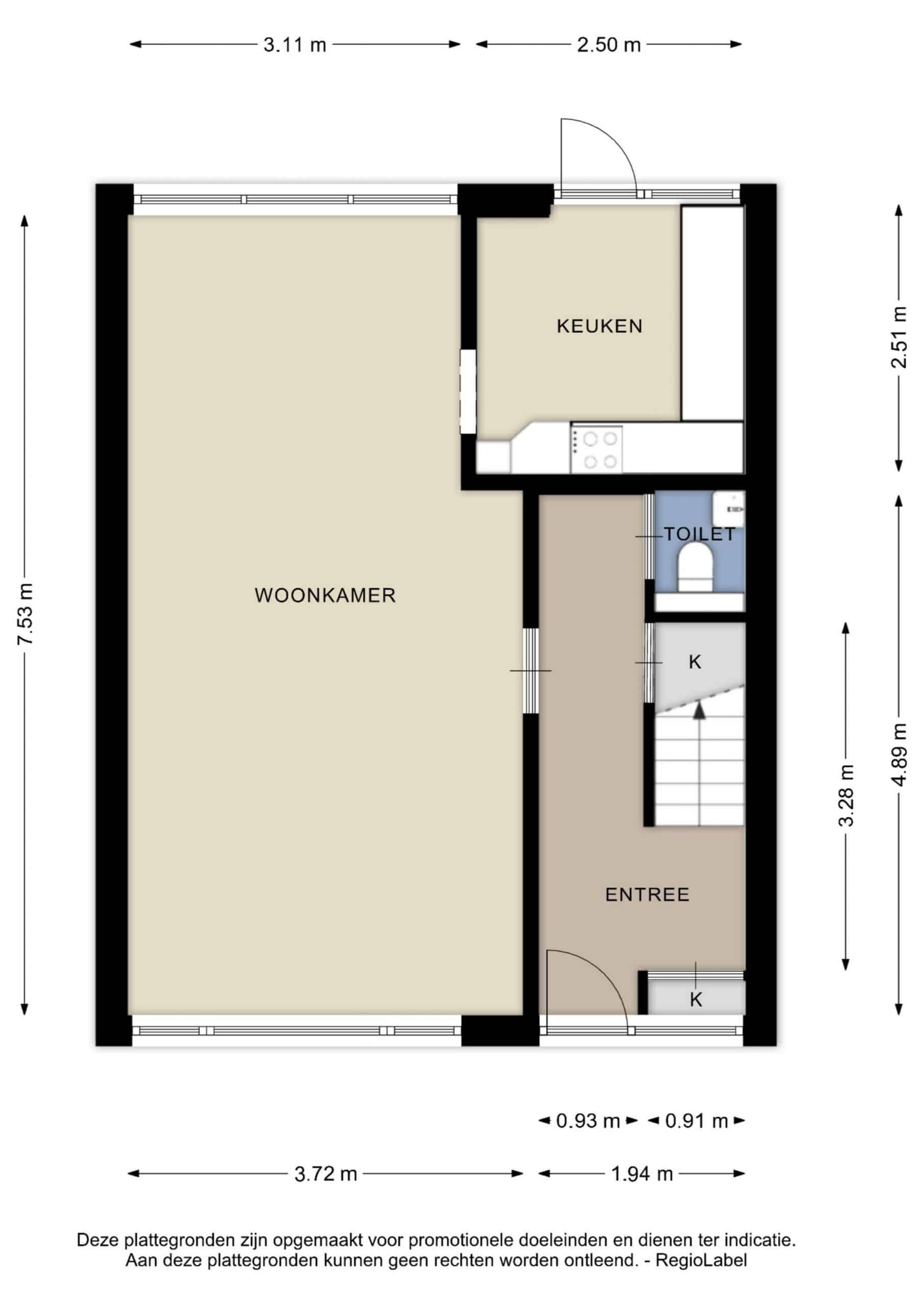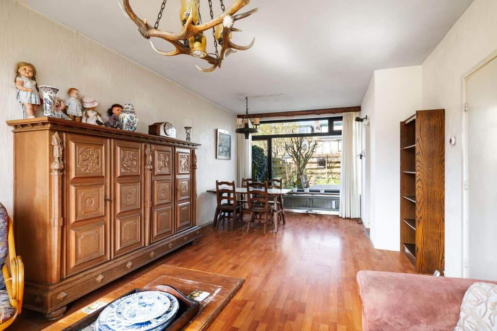 Door de woning heen: Bij binnenkomst in de hal tref je de meterkast, een praktische trapkast en een gemoderniseerd toilet. Vanuit de hal loop je door naar de woonkamer, waar de grote raampartijen aan zowel de voor- als achterzijde zorgen voor een prettige lichtinval. Er is voldoende ruimte voor zowel een comfortabele zithoek als een eethoek met zicht op de tuin.