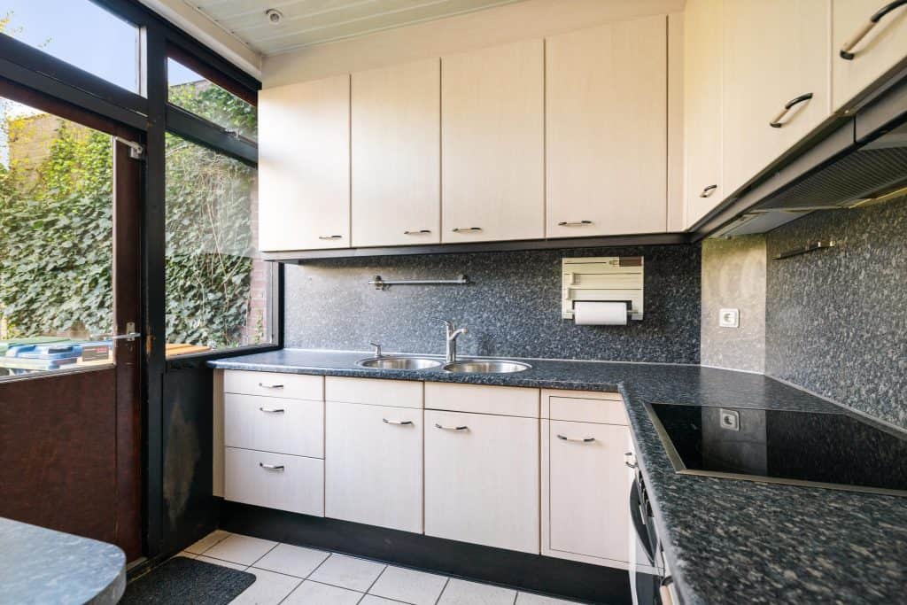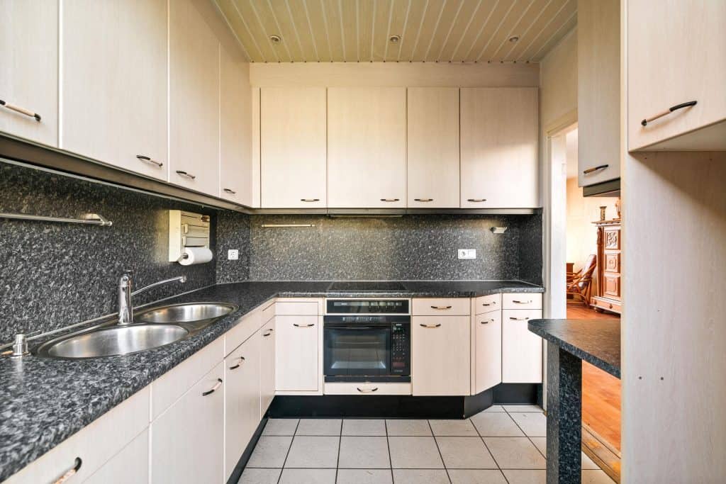 De keuken bevindt zich naast de woonkamer. De keuken is niet nieuw meer maar voorzien van inbouwapparatuur en uitgevoerd in een lichte kleurstelling. Desgewenst kan de keuken bij de woonkamer worden betrokken om een open leefruimte te creëren.