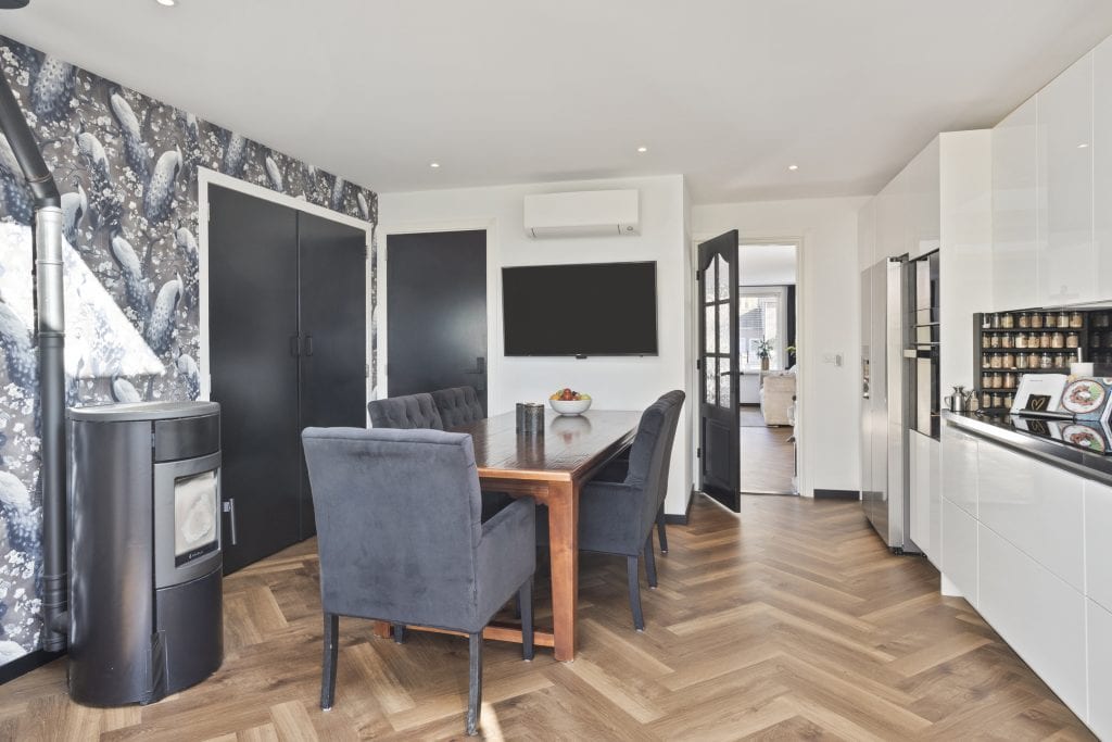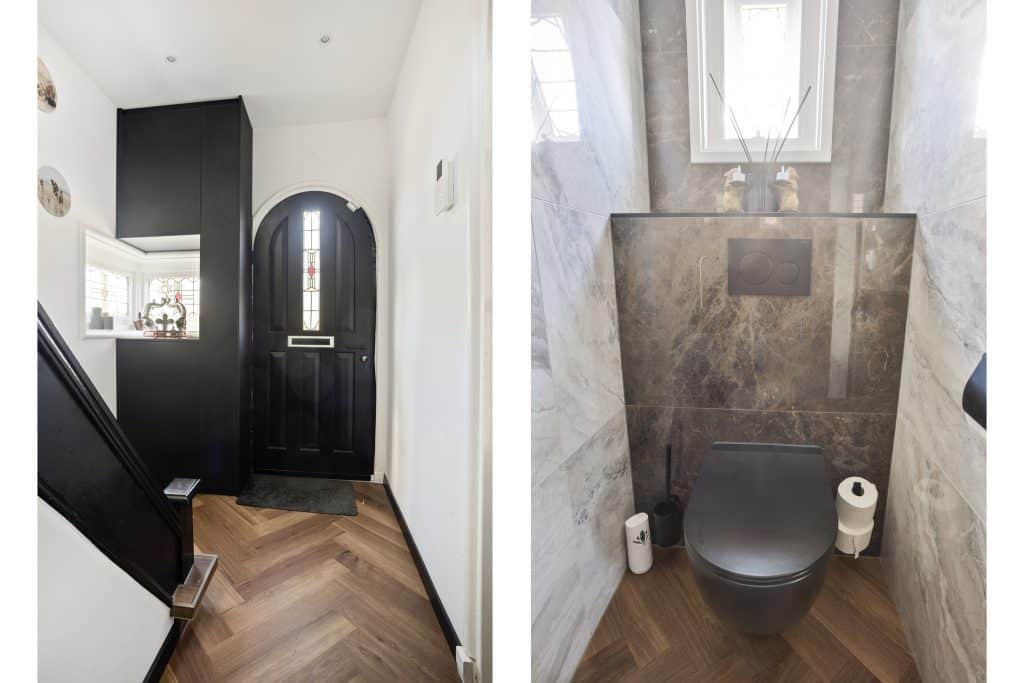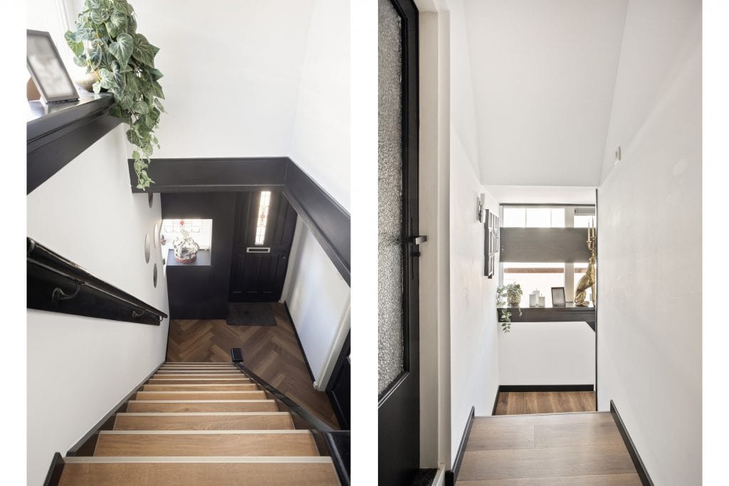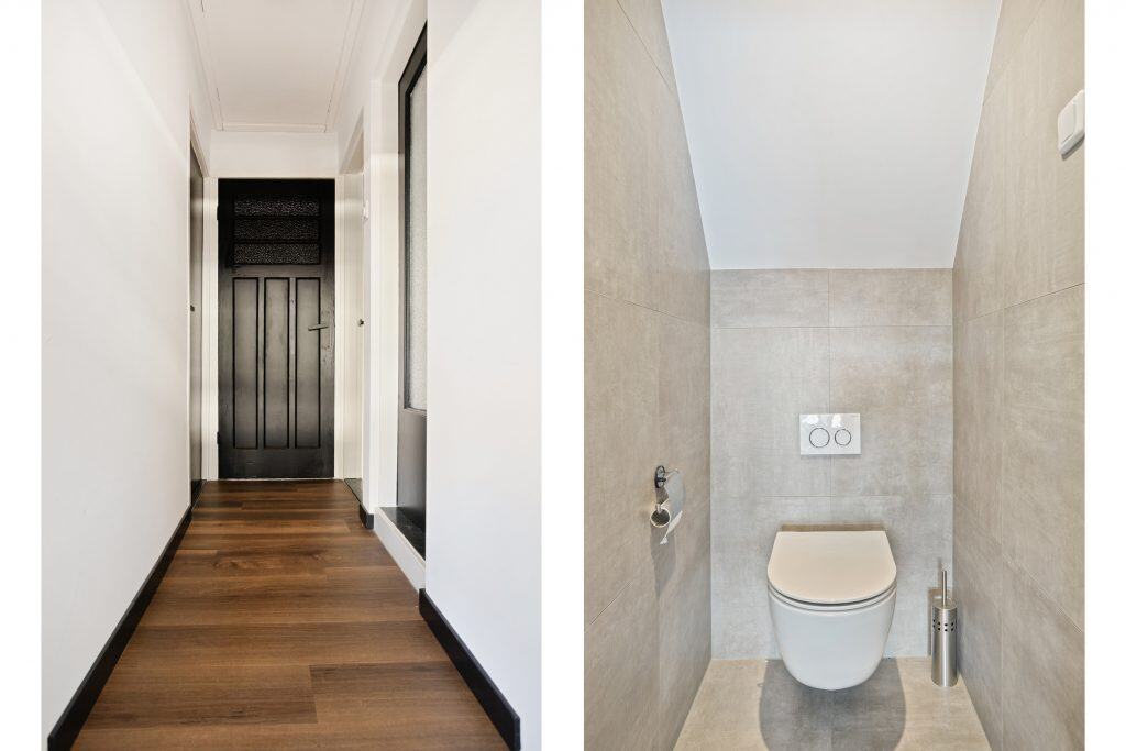 Entree in de hal met glas-in-loodramen (in isolerend glas), modern toilet en trapopgang. Vanuit hier bereik je de lichte, royale woonkamer met PVC visgraatvloer, vloerverwarming, houtkachel en airco. Aan de achterzijde bevindt zich de moderne woonkeuken (2024), voorzien van diverse inbouwapparatuur, airco en pelletkachel. Via openslaande deuren sta je in directe verbinding met het overdekte terras en de tuin. Aansluitend vind je een praktische bijkeuken met aansluitingen voor wasapparatuur en toegang tot de kelder.
