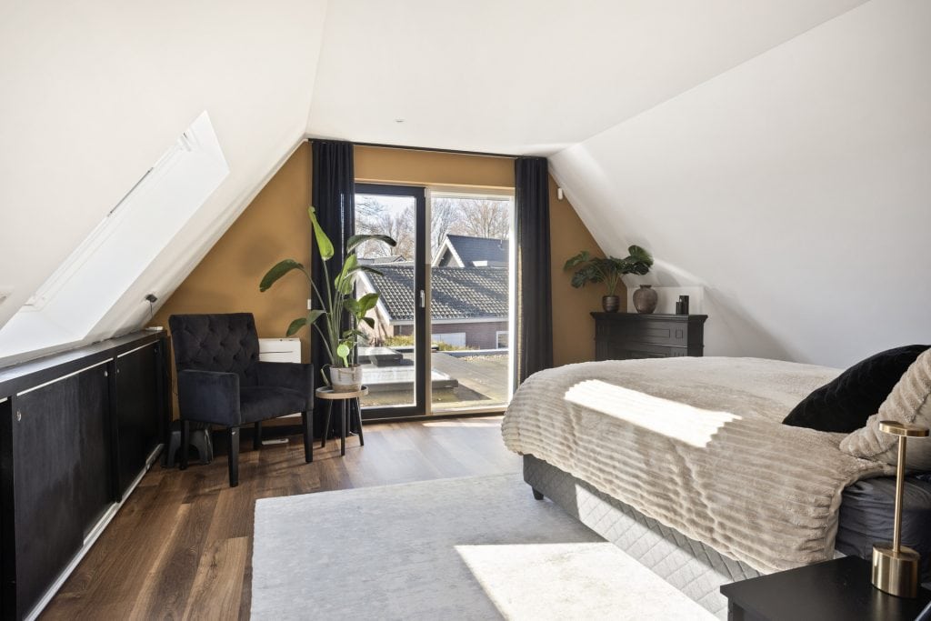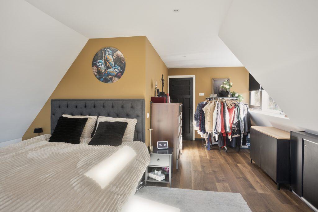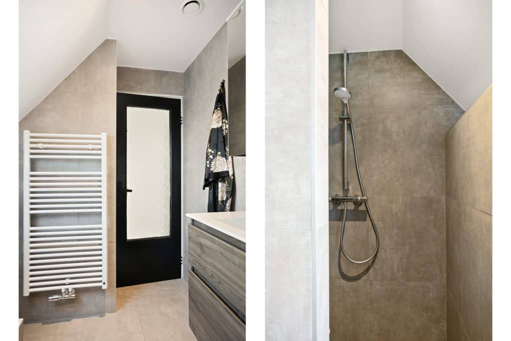 De moderne badkamer beschikt over een ligbad, douche en wastafel. Tevens is er een separaat toilet aanwezig. Via een vlizotrap is een ruime vliering bereikbaar.